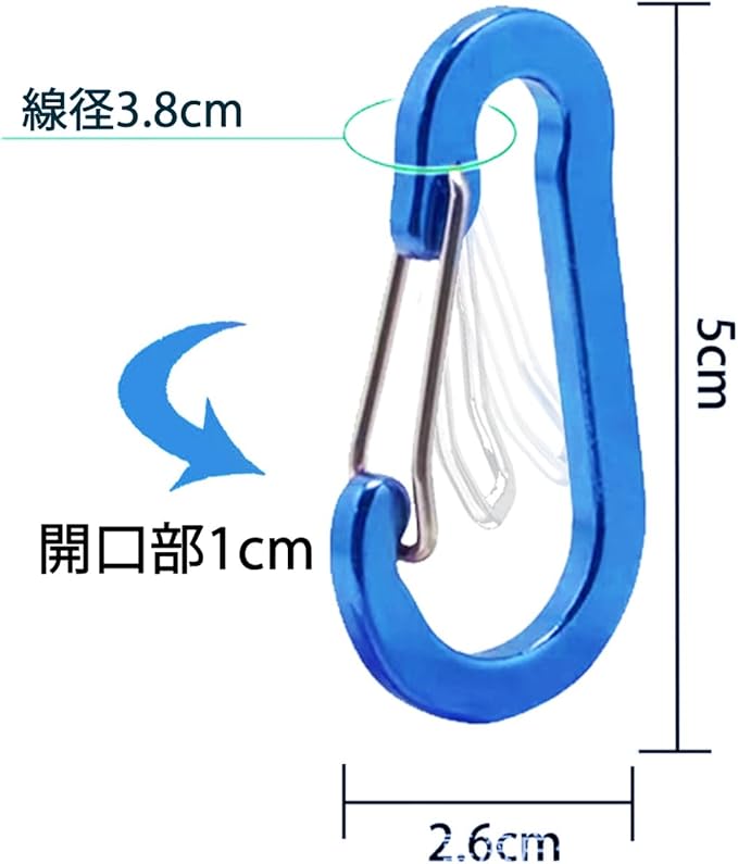 【製品仕様】商品内に含む:20個のアルミニウム合金カラビナ、サイズ長さ約5cm、幅さ約2.63cm、厚み約4mm、重量約5g(単個重量)超軽量。安全耐荷重:約50kg。