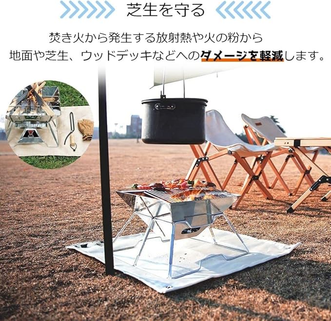 小型の焚き火台に便利なSサイズ(50cm 50cm)焚き火台使用時の最低限の芝生の保護に便利です。出来るだけ荷物を減らしたいバイクパッカーにもお勧めです