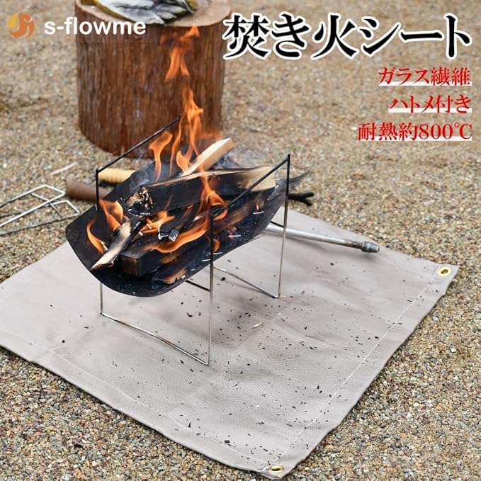 【安全・安心の耐熱性能!瞬間耐熱温度800℃】耐熱性の高いガラス繊維の特殊な生地『グラスファイバー』を採用しております。燃える薪の温度は、一般的に250度から450度程度といわれています。※薪の種類や周囲の環境によって異なります。s-flowme(スフローム)TAKIBI SHEET(焚き火シート)は耐熱温度は500℃(瞬間耐熱温度は800℃)。放射熱や火の粉から地面や芝生などへのダメージを軽減します。【極厚仕様!丈夫で長く使用可能】ほつれない生地を使用している為、丈夫で長持ち!火の粉が付いてもチリチリにならず、縫い目もしっかりしている為、長くご使用頂けます。【ガラス繊維がチクチクしない】生地の表面は特殊な加工を施していますので、グラスファイバー独特のチクチク感を大幅に軽減しています。なめらかな手触りで、いつでも快適にご使用いただけます。※ガラス繊維生地を使用していますので、ご使用の際は手袋などの着用をお勧めいたします。※特にお肌の敏感な方やお子様のご使用をご注意ください。【柔らかい生地で収納に便利】生地は柔らかいので、焚火シートを折りたたんでコンパクトに収納することができます。