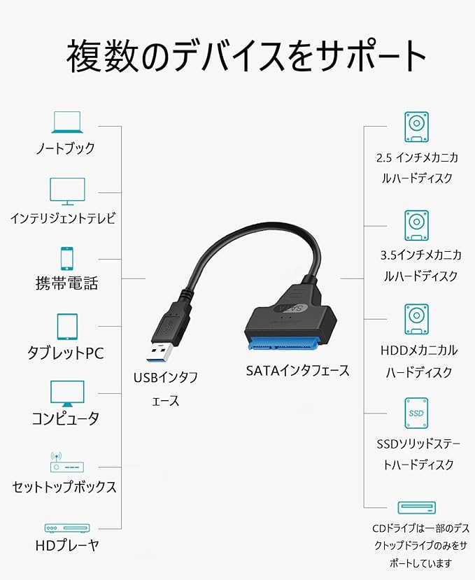 【幅広い互換性】USB2.0の互換性があります USB3.0-SATAケーブルは、2.5インチSATA SSD及びHDDと完全に互換性がありますラップトップやデスクトップに加えて、スマートTVやルーターなどに接続して、クローン作成、バックアップコピー、TV録画、ストレージ拡張に対応できますWindows 7/8/10、Linux、Mac OSおよびその他のデバイスに適しています。
