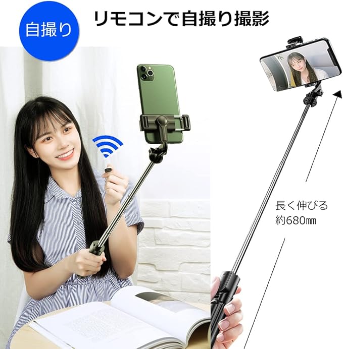 ・自分撮り棒と三脚が一体化されたデザインなので、自分撮りだけではなく、集合写真、動画鑑賞、ライブ配信など固定した状態でも使用可能です。