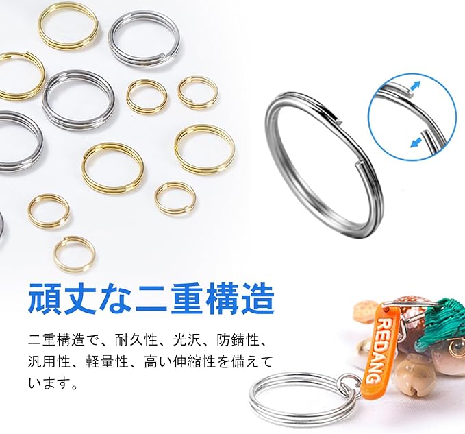 【高品質な素材】 二重丸カンは上質な合金を採用しており、耐久性に優れて、長くご利用いただけるマルカンです。二重構造で、耐久性、光沢、防錆性、汎用性、軽量性、高い伸縮性を備えています。耐食性があるため、錆びにくく軽量で、弾力性が高いので、大きく変形をさせたり、頻繁に鍵をつけ外ししたりする用途にもできです。平リングは二重構造でかなり頑丈なので大切な鍵やキーホルダーの紛失防止に、しっかり閉じました。