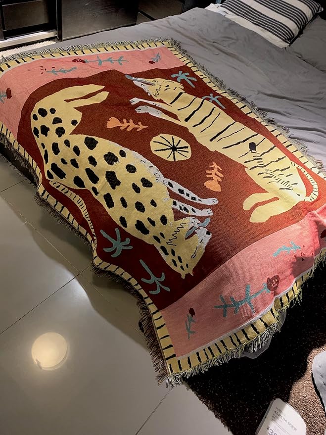 この魅力的なアニマル柄ブランケットで、お部屋をスタイリッシュに演出してみませんか?ヒョウ柄、タイガー柄、チーター柄が絶妙に融合したユニークなデザインは、目を引くピンクベースで、お部屋のアクセントとして存在感を放ちます