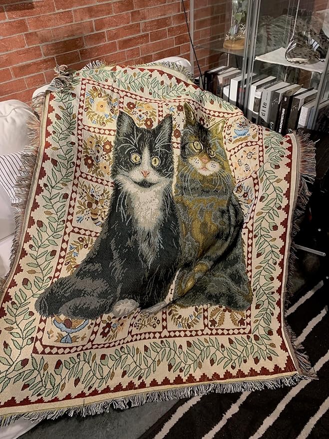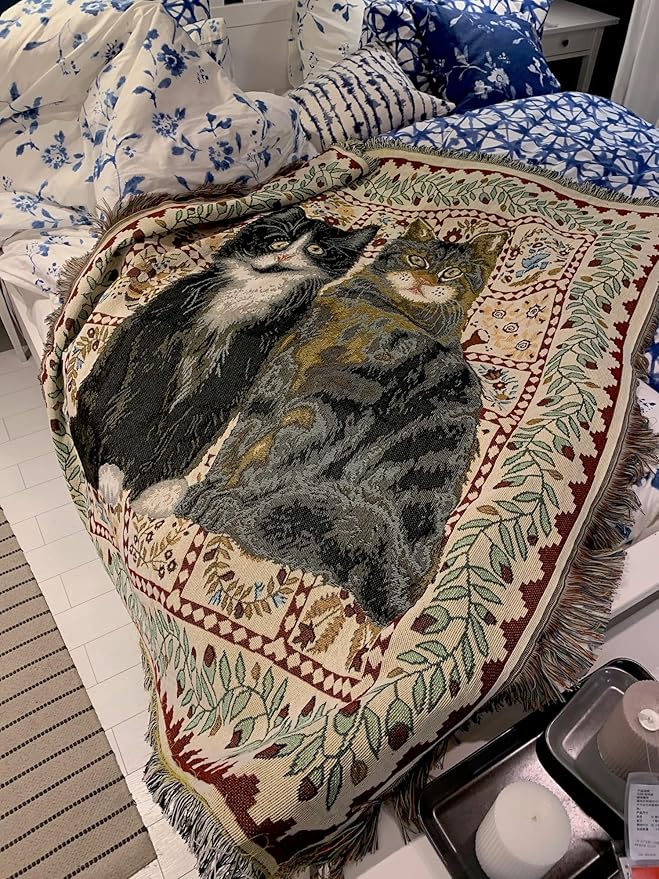 猫柄スローブランケット1枚、ヴィンテージファブリックスリーピングブランケット、ソファ、読書、オフィス用。