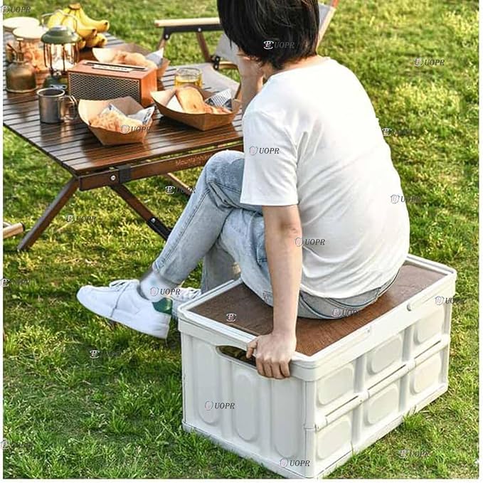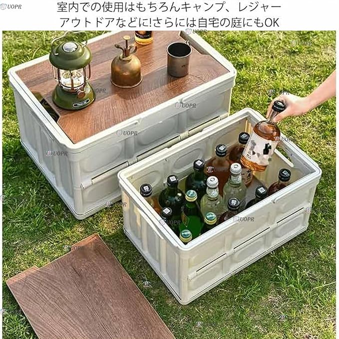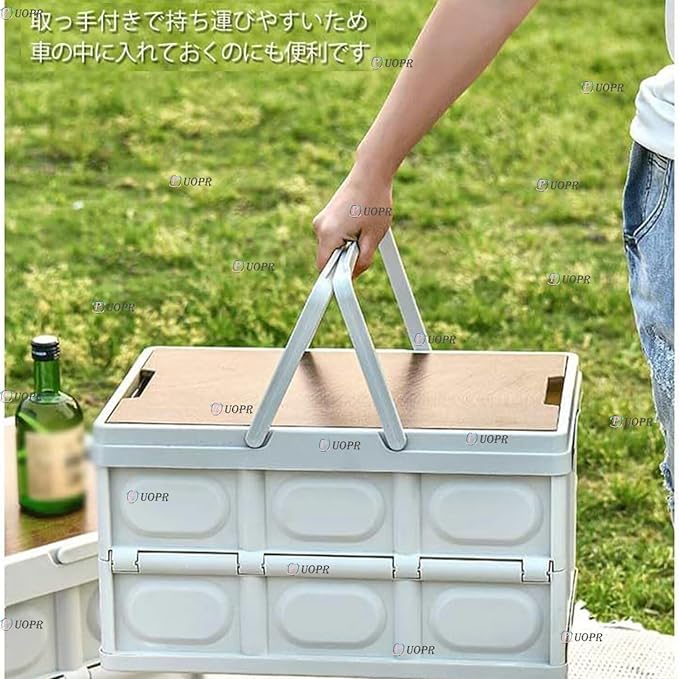 "「使用時:52 36 29 cm収納時:52 36 6.5 cm スタイリッシュな木製カバー付き折りたたみコンテナ。【56 L・蓋付き・ハンドル付き・簡易テーブル】 木製天板は取り外し可能で、簡易テーブルとしても使用できます。 蓋がついているので車に乗せやすいので、車庫や屋外などほこりが気になる場所でも中身をしっかり保護しましょう。 取っ手付きで持ち運びしやすいので、車の中に置いておくのも便利です。大容量コンテナですが、使わないときは折りたたむことができます。6 cmとコンパクトな厚さなので、不要なときにも省スペースで保管できます。 室内使用はもちろんキャンプ、レジャー、アウトドアなど!しかも自宅の庭でもできる」"