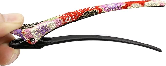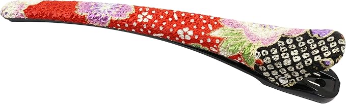 バレッタ上部(プラスチック製)を美しい和柄のちりめん生地でくるんだアクセサリー感覚の髪留めです。【長さ約12.5㎝、高さ約1.8cm、横約1.5cm】