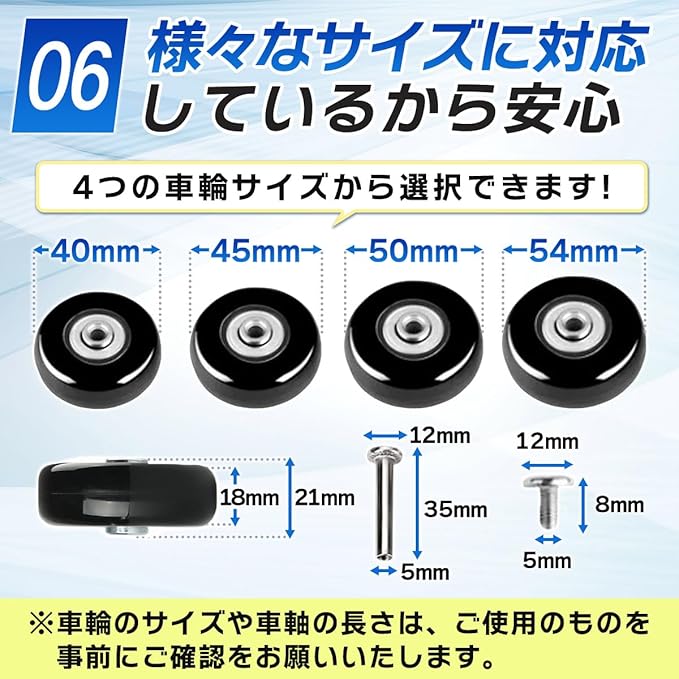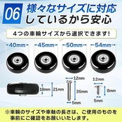 4つの車輪サイズ(40mm、45mm、50mm、54mm)から選択可能だから、幅広いスーツケースに対応!※HOTにより車軸が硬くノコギリで切れない場合があります。その際は電動ノコギリ等でご対応をお願いいたします。手軽にタイヤ交換し、大切なスーツケースを新たな旅のパートナーにしましょう。