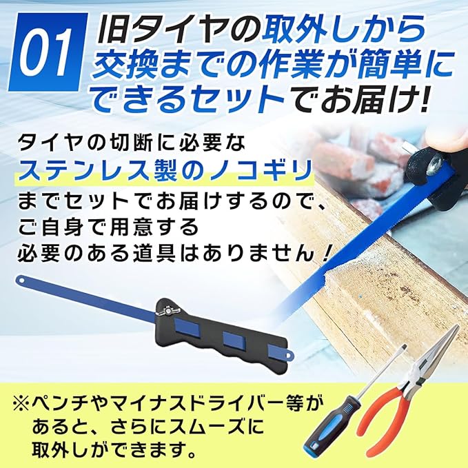 タイヤの切断に必要なステンレス製のノコギリもセットでお届けするので、初心者でも道具の用意不要で簡単な交換が可能。