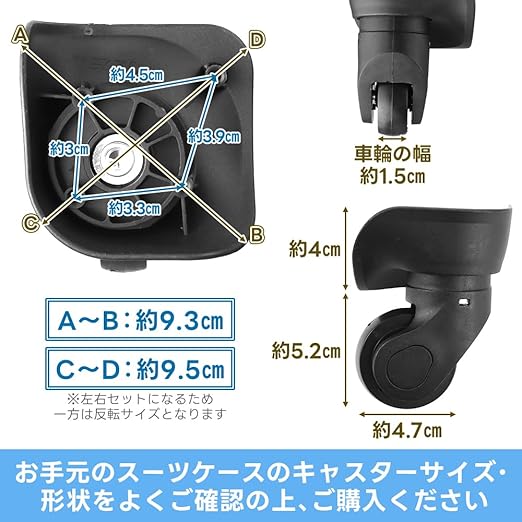【セット内容】交換用キャスター 4点 【サイズ(約)】車輪:4.7cm 5.2cm 車輪幅:1.5cm 【カラー】ブラック ※お手元のスーツケースのキャスターサイズ・形状をよくご確認の上、ご購入ください。