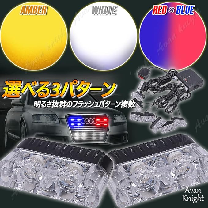 動作電圧:12V バリエーション:レッド ブルー / ホワイト / アンバー セット内容:2LED 8灯ストロボライト・コントロールボックス・変換スイッチ LEDサイズ(約):長さ5cm 高さ1.5cm 奥行3cm