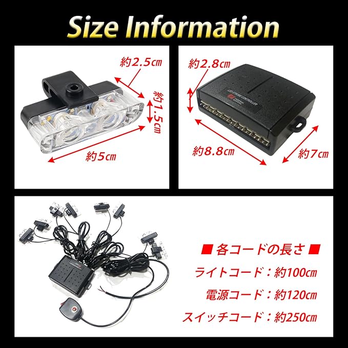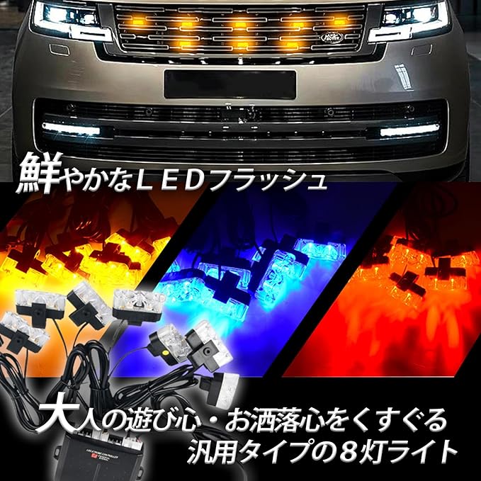 【DIYカスタマイズ】キットには、2LEDライトが8個、コントロールボックス、スイッチ、電源コードが含まれています。レッド&ブルーはライト各4個ずつ。出荷前に点灯確認済。動作電圧:12V【バリエーション】 ホワイト、 アンバー、レッド ブルー。※取り付け場所により、防水加工をしてください。※説明書は付属していません。
