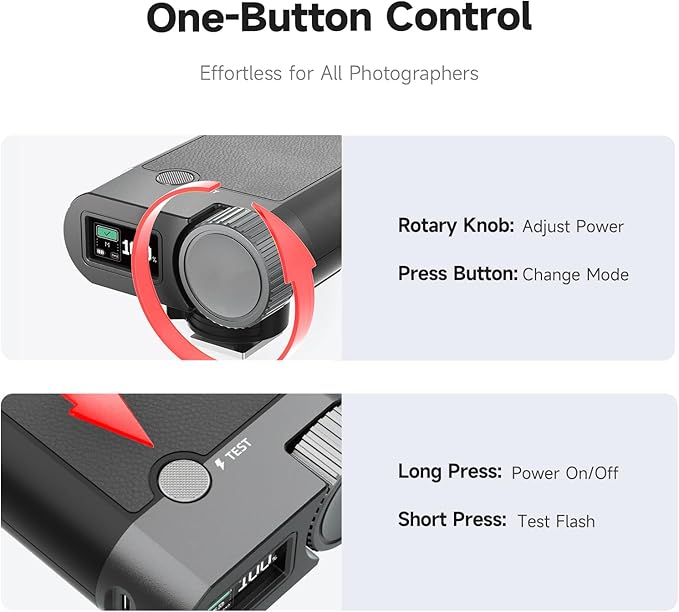 10段階出力:出力範囲は1/1~1/128の10段階。さまざまな環境の露出ニーズに対応します。付属の7色のカラーフィルターで、異なる雰囲気の写真を撮影できます。G01ミニフラッシュキット1つで、あらゆるタイプの写真を撮影できます。(フラッシュをオンにするには:画面に電源インジケーターが表示されるまで上部のボタンを長押しし、ノブを時計回りに90度回します。)