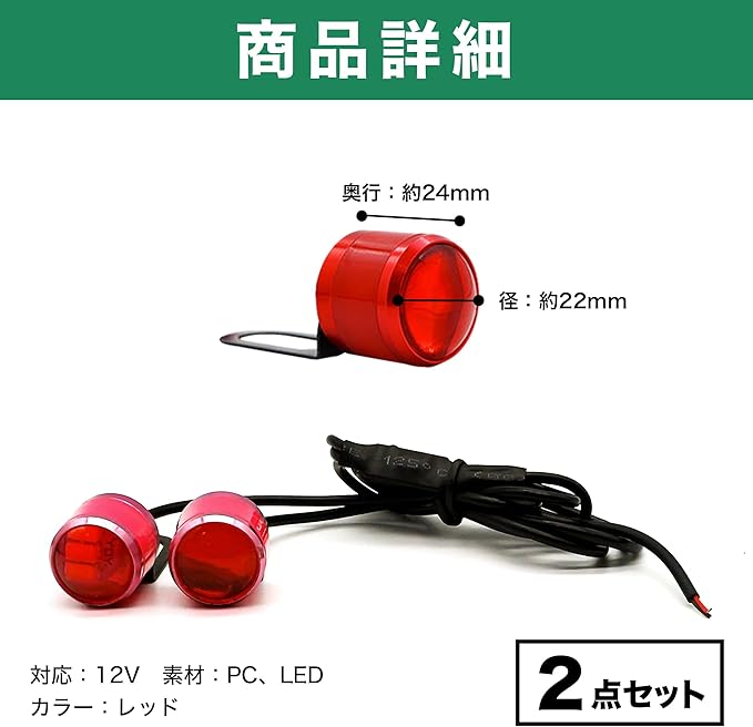 セット内容:2点セット サイズ:径約22mm 奥行約24mm 対応:12V 素材:PC、LED カラー:レッド ※モニターの環境等により、色の見え方に若干差が生じる場合がございます。