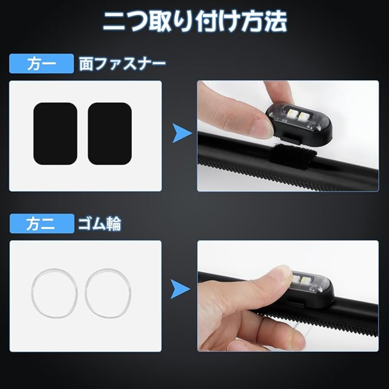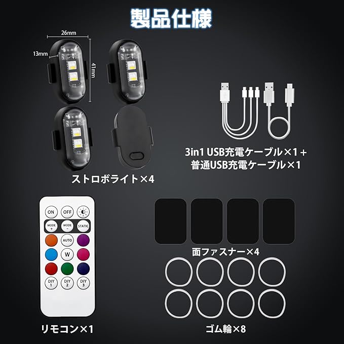 【防水規格・多用途対応】充電端子にはカバーが付いており、アウトドア使用時や雨の日でも大丈夫です。リモコンで操作できるため、バイク、自転車、ラジコンカー、スクーター、ドローンなど、さまざまなシーンで活躍します。※カバーとストロボライトは別々に取り外し可能なため、充電時にカバーを紛失しないようご注意ください。
