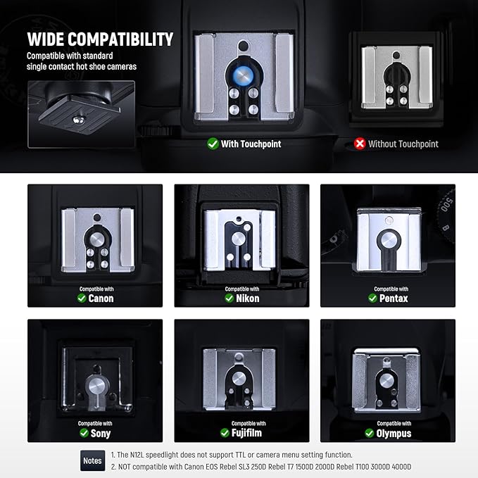 【幅広いカメラに対応】ミニフォトストロボフラッシュは汎用性を設計され、標準ホットシューを備えた幅広いカメラに対応し、コンパチブル ZV1、A7iii、Fujifilm DSLR。ご注意: 1. N12LスピードライトはTTLまたはカメラメニュー設定機能をサポートしていません。2. EOS Rebel SL3、250D、Rebel T7、1500D、2000D、Rebel T100、3000D、4000Dには対応していません。