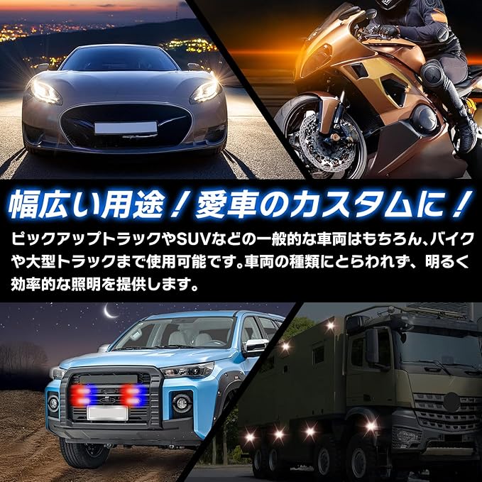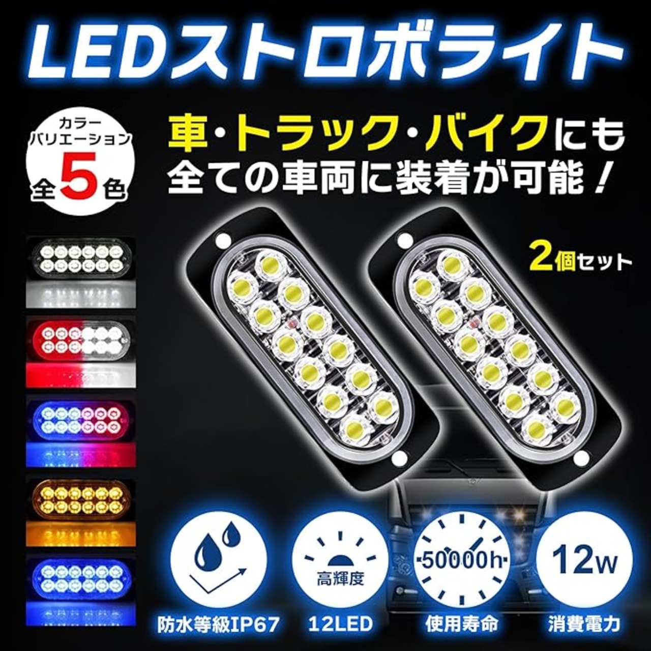 【特徴】あなたの愛車を際立たせる、高輝度LEDストロボライトで、17種類のフラッシュパターンがあります。12V、24V対応で汎用性も抜群なため、車、バイク、トラックなど、様々な車両に装着可能。IP67等級の防水加工済みなので、悪天候時でも使用できます。爆光LEDが周囲の視線を釘付けにし、存在感をアピール。カスタムパーツとして、愛車を個性的に演出したい方におすすめです。2個セット。