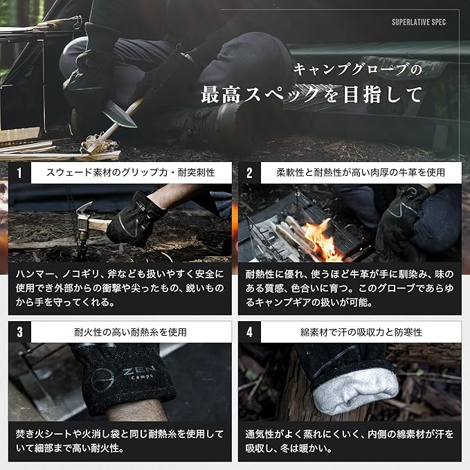 【材料】手袋本体:牛革 裏地:100%綿 ZEN Camps 耐熱性と作業製に優れたキャンプ専用グローブ。キャンプ用、アウトドア用 、BBQ用に最適です。