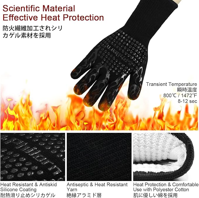 【二重構造・耐熱最高温度:800℃】 鍋つかみ耐熱ミトンは二重構造となっており、外部には、耐熱、耐刃に優れた防火繊維と加工されたシリカゲル素材にて熱遮断バリアを形成し、優れた耐火&耐熱効果を持って、800℃の高温から両手を守る耐熱ミトンです(瞬間温度)。内部層は綿100%の上質な生地を使用し、伸縮性、通気性が良いため夏場や長時間の使用でも快適に使えます。