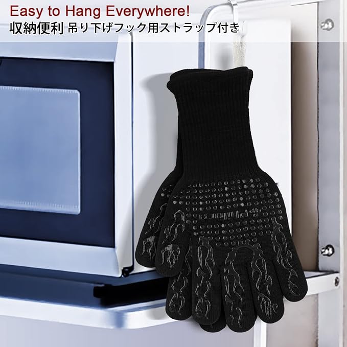 【耐熱ミトン・丸洗い可能】5本指耐熱ミトンは何度でも洗濯できで繰り返し使用可能なので、汚れも気にせず使えます。吊り下げフック用のストラップ付いて、使用しない時は壁に引っ掛けることができて、収納便利です。