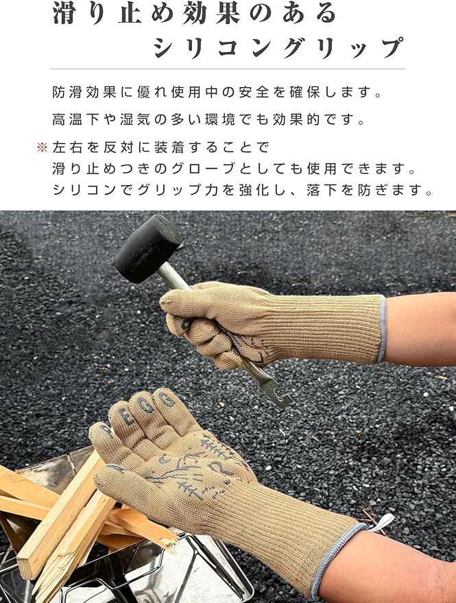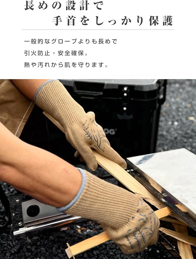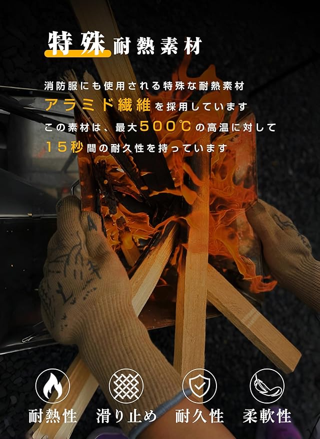 【熱伝導遅延設計】外側に耐熱素材とシリコンを使用し、熱伝導を遅らせる設計です。これにより、炭火や熱い調理器具を扱う際も、手に熱が伝わりにくく、安全に作業できます。高温環境での快適さを提供します。