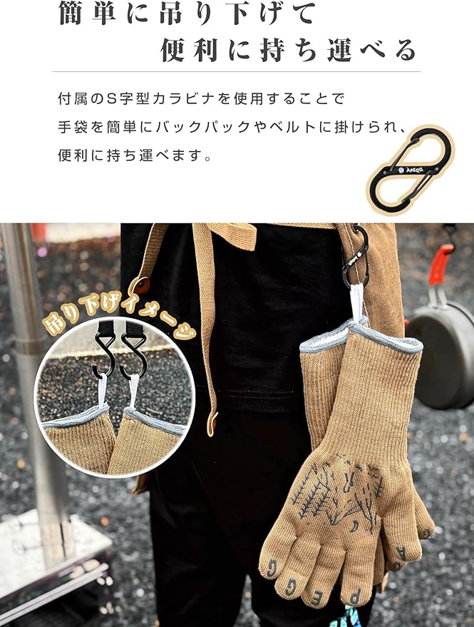 【シーン:アウトドアから家庭まで】本製品は、BBQ、焚き火、キャンプ、登山、溶接作業などの多様なアウトドアシーンに広く適応しています。また、キッチンでの調理や園芸作業など、家庭での日常的な作業にも大変便利なツールです。さらに、S字型カラビナが付いており、携帯が簡単で、使用もより便利です。