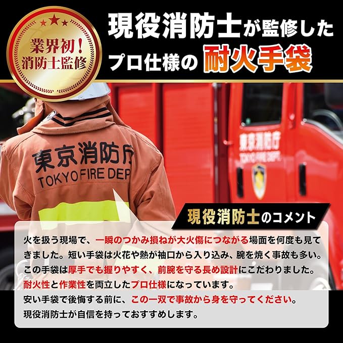 【安心保証付きでサイズ交換も対応】日本限定商品で、現役消防士が監修した品質を持ち、安心保証が付いており、サイズが合わなければ交換対応も可能なため、初めて耐熱グローブを選ぶ方にも安心してお使いいただけます。