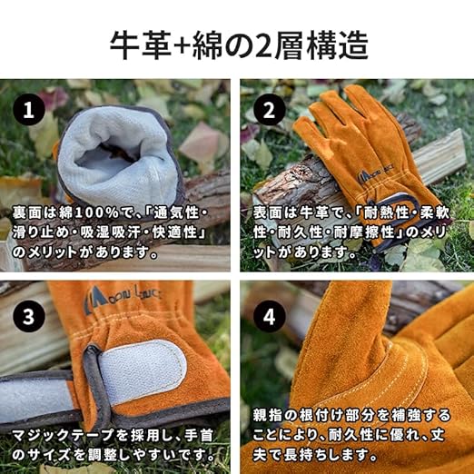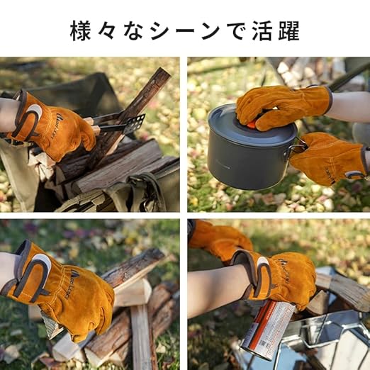 【耐熱グローブの情報】焚き火グローブは2層があります。①外側牛革で耐熱性や耐久性高いです。②中側100%綿で手を守るし、遮熱性も向上します。2サイズ、男女兼用+オールシーズン。