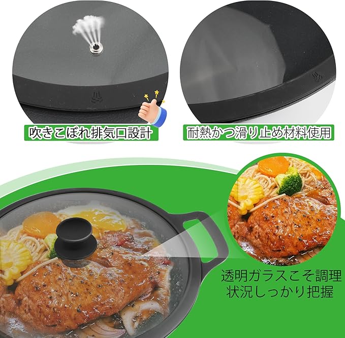 ✅【調理物丸見え】ガラス蓋だから食材の火の通り具合や、裏返すタイミングがひと目でわかるのが使いやすい。またある程度の重みがあるのでフタも浮きにくく、安心安全