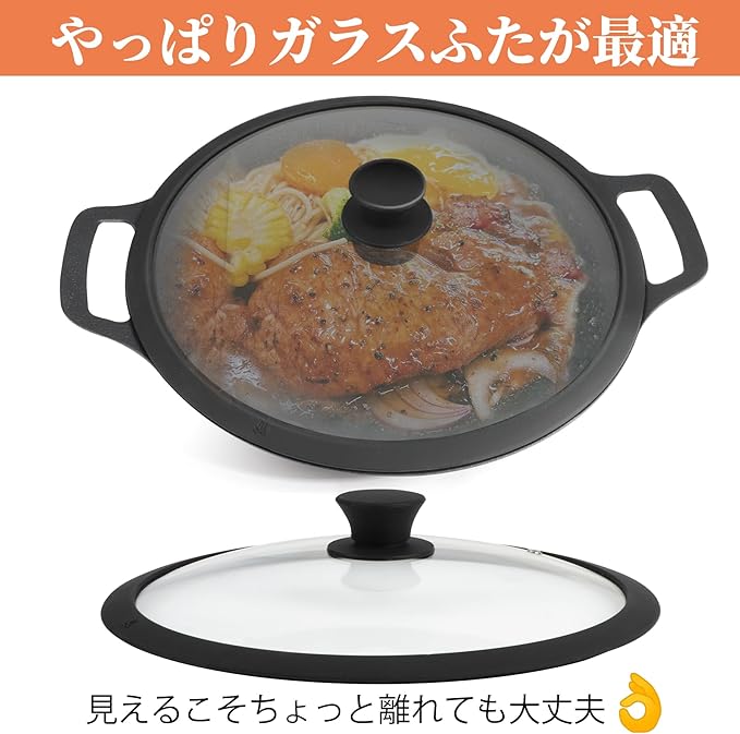 ✅【調理物丸見え】ガラス蓋だから食材の火の通り具合や、裏返すタイミングがひと目でわかるのが使いやすい。またある程度の重みがあるのでフタも浮きにくく、安心安全