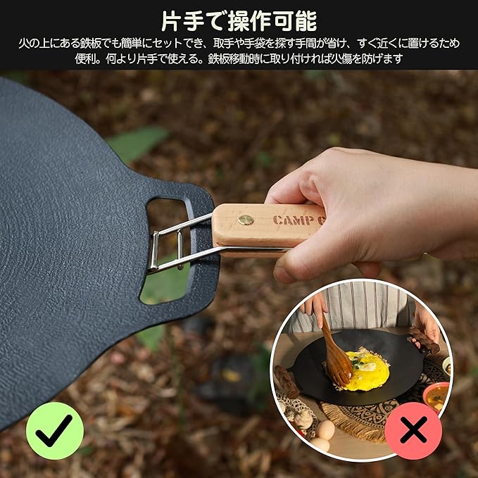 【片手で操作可能】火の上にある鉄板でも簡単にセットでき、取手や手袋を探す手間が省け、すぐ近くに置けるため便利。何より片手で使える。鉄板移動時に取り付ければ火傷を防げます 。