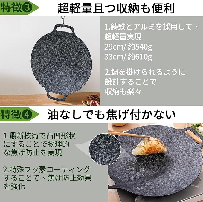 【日丸優品】マルチグリドル 鉄板 IH 直火 ガス火 直径29cm アウトドア 家庭 グリドルパン バーベキュー ソロキャンプ 軽量 シーズニング不要 お手入れ簡単 取っ手収納バッグ付属 (29cm) | etshop