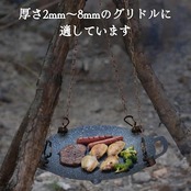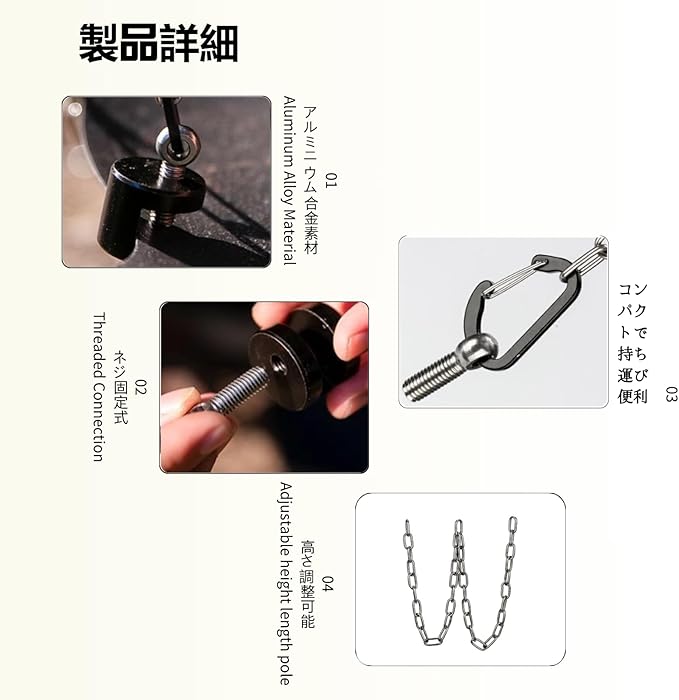 2⛺【製品パラメータ】カラー:ブラック、スタンド素材:アルミニウム合金、チェーン:304ステンレス鋼、スタンド重量:約324.5g、チェーンの長さ:50cm、厚さ2mm~8mmのグリドルに最適、セット内容:ねじ式コネクタ 4、鉄製チェーン 4、Dバックル 5、ステンレス鋼ネジ 4