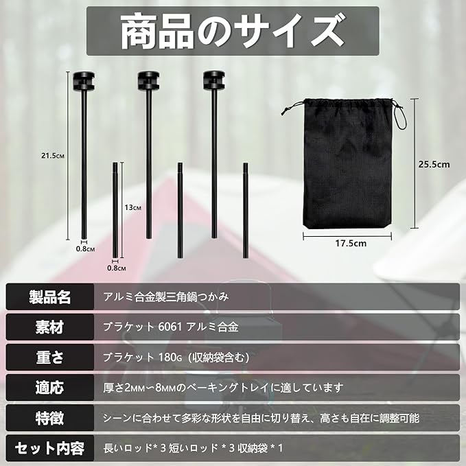 【商品の仕樣】 サイズ:長さ21.5cmと13cmのアルミ合金脚を各3本いれます。厚さ2mm ー8mmのマルチグリドルパンに適しています。