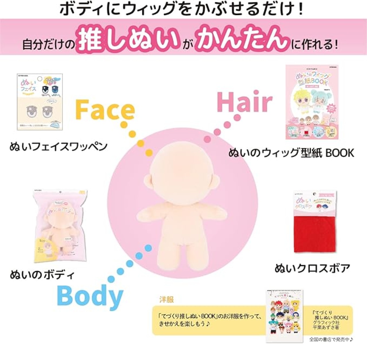 はじめての方でも、自分だけの推しぬいが簡単に作れる! 別売りの「 てづくり推しぬいBOOK 」掲載の 型紙 で作成した、ぬいのボディのMサイズ。 マッシュショート の ウィッグ が作れる 実物大 型紙 & レシピ が見れる QRコード 付き! ボディはS・M・Lの3サイズ展開。別売りの「 ぬいクロス ボア /WP ホワイトピーチ」を使用した、やわらかな手触りが特徴のボディが癒やしてくれます♪