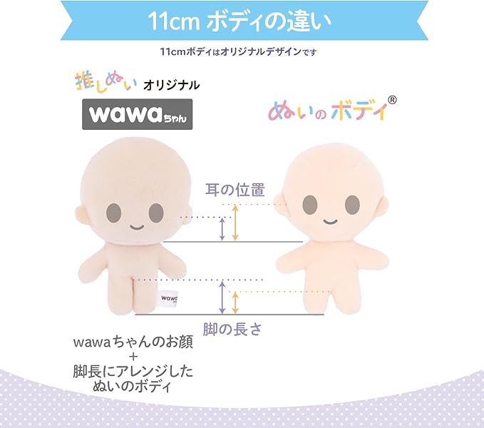 wawaちゃんのお顔にぬいのボディの型紙を合わせて脚長にアレンジしたミニサイズボディです。