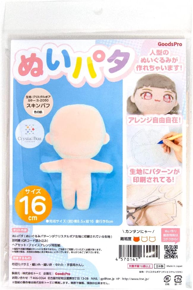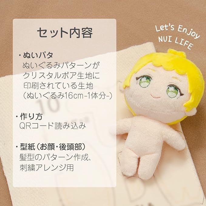 人型のぬいぐるみが楽に作れちゃう便利なセット! クリスタルボアの生地に、ぬいぐるみのパターンが印刷されているので面倒な型紙の書き写しも不要。