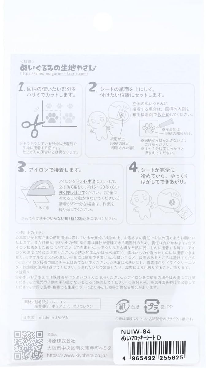 ぬい(ぬいぐるみ)の顔・体・お洋服に貼り付けることができる、アイロン接着タイプのフロッキーシートです。