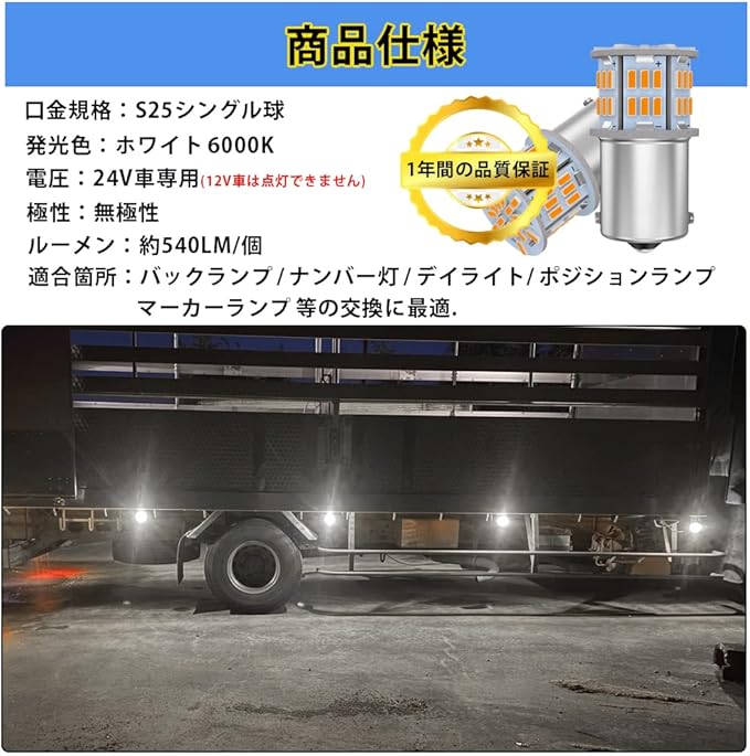 【24V S25 LEDシングル ホワイト】24V大型車に適用。定電流回路搭載なので、車両電圧の変化に影響されず、安定した点灯を持続します。『ご注意:12V自動車とバイク使用不可』.