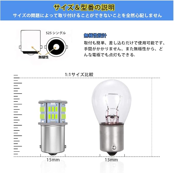 【無極性&簡単取付】純正球(S25)とほぼ同じサイズなので、極性フリーで、取付は簡単!原箇所のまま差し込むだけで取付ます。適用ソケット:ポジションランプ/ バックランプ /トラック LED マーカーランプ。適用ソケット:S25 P21W 1156 BA15S G18.