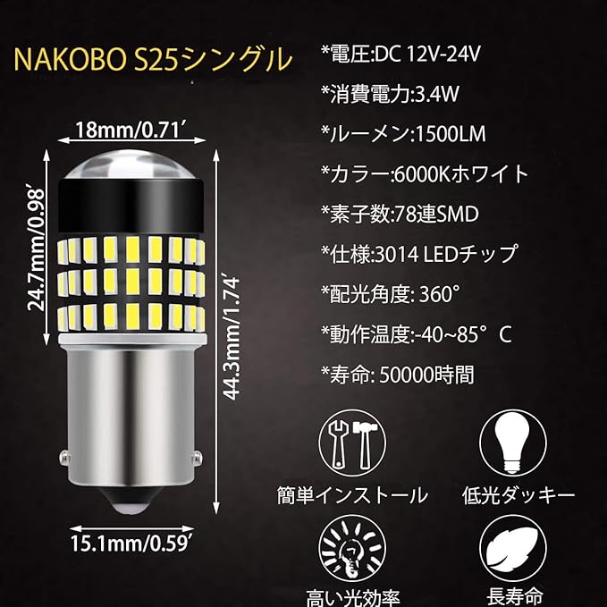 NAKOBO S25シングル 2個入り 12V-24V G18 LED P21W BA15S バルブ LEDライト 車用 78連3014チップ ランプ 汎用 変換 1500LM /ホワイト | etshop
