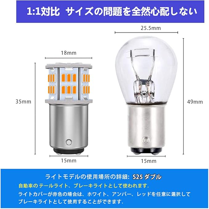 【形状】S25_180 ダブル(1157 BAY15D P21/5W)兼用、12V車専用,1080LM/2個 54LED 3014SMD アンバー 。ブレーキランプとして使用する時、効率は1.32Wです。