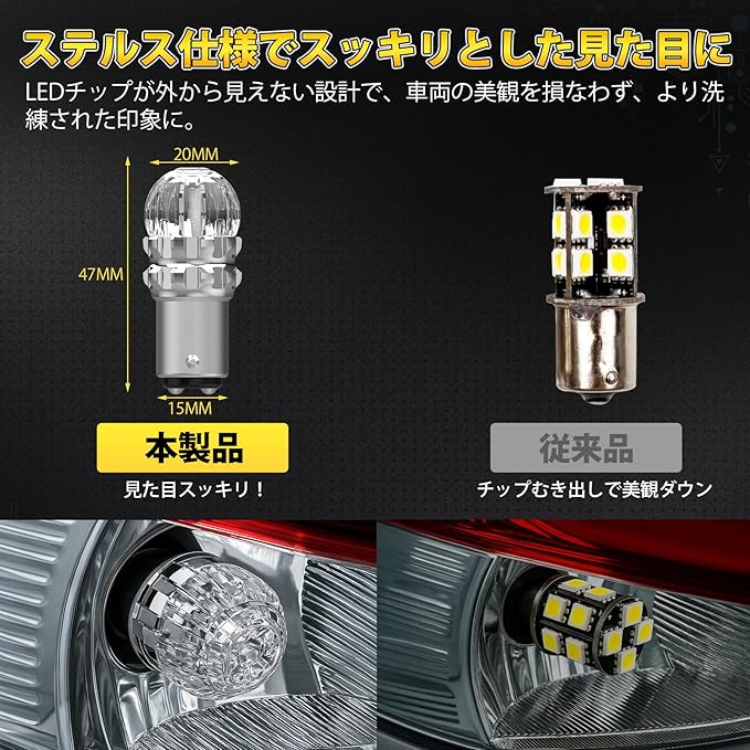 【ステルス仕様&優れた耐久性】高級LEDバルブをお探しですか?Perrace s25 led ダブル球は、高品質な銀色ボディと硬い保護カバーを採用し、LEDチップを外部の汚れや衝撃からしっかり守ります。LEDチップは外に露出せず、車両の美観を損なうことなく、より洗練された印象を与えます。さらに、99%透過率で、光がクリアで均一、360 全方向に豊かな光を提供し、高輝度と長寿命を実現!耐熱温度180℃を誇り、過酷な環境でも安定した性能を発揮し、長期間の使用にも耐える優れた耐久性を備えています。