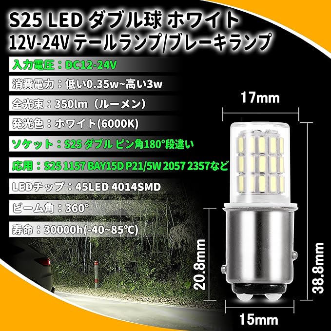 ✿【超高輝度】12V、24V兼用 4014 SMD LED素子45連搭載。全方向360 広配光、それはより高い明るさとより広い範囲で、360 全方向に照らすことができます。S25 ダブル 1157 BAY15D P21/5W 1016 1034 1196 2057 2357 2397 3496 7528 94 など。取り付けが簡単! 原箇所のまま差し込むだけで取付ます。
