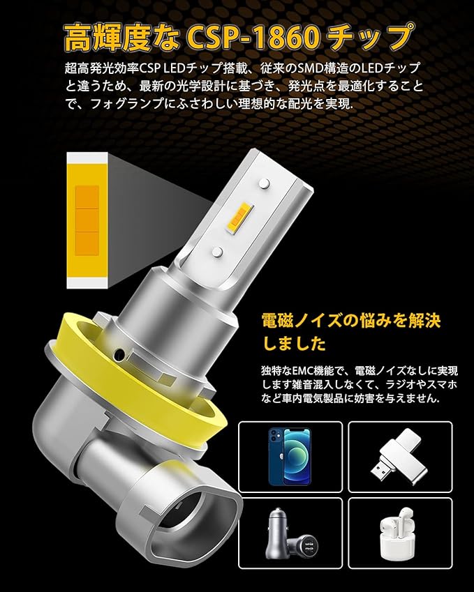 ★【高品質CSP1860SMD LED素子】純正発光を実現するヘッドライト!高品質 CSP LEDチップ採用、発光効率が大部アップ!ルーメン度が2000LM。3000Kの色温度、抜群な明るさ、純白な色と360 光線角度で、視野範囲最大限に増やせます。