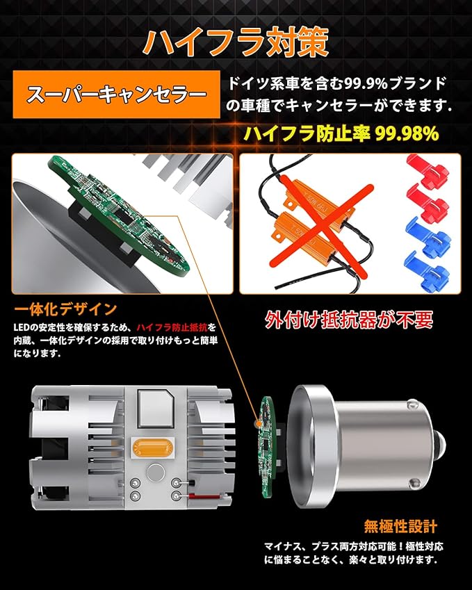 【スーパーキャンセラー】S25 ピン角違い LED ウィンカーバルブ 専用。ハイフラ防止抵抗搭載、日本車利用は全く問題ないし、ほとんどのドイツ系車(フォルクスワーゲンやBMWなど、ほとんどの車がキャンセラーできる)でさえあるので、できない場合は連絡してください。