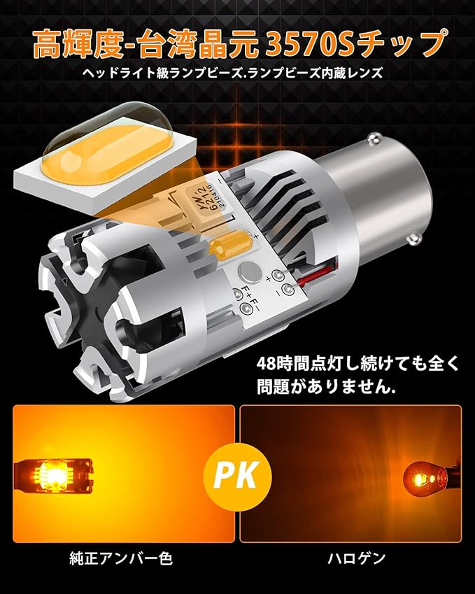 【超高輝度&ハイパワー28W/個】純正アンバー、ヘッドライト級LEDバルブ 2000LM超高輝度の台湾晶元3570Sチップを2個搭載。明るさで車両後方をより遠くて広くまで照射可能、安全性が大幅に向上します。ノイズ対策済みでFMラジオへの電波干渉によるノイズが発生しません。