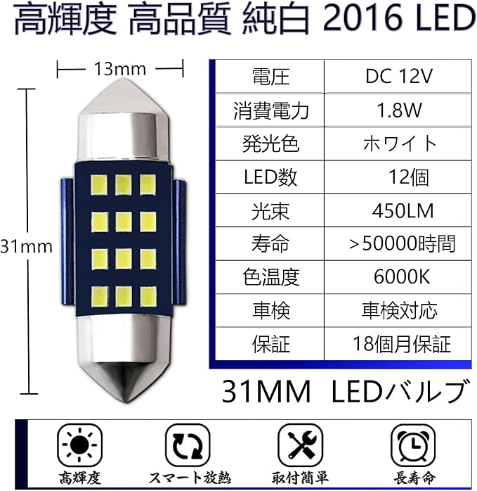 形状: T10 31mm ルームランプ LEDチップ: 2016SMD 12連 DC12V車用 セット数:4個,パッケージ:帯電防止袋 【HOT保証】限定商品名:TORIBIO(登録第6135494号)