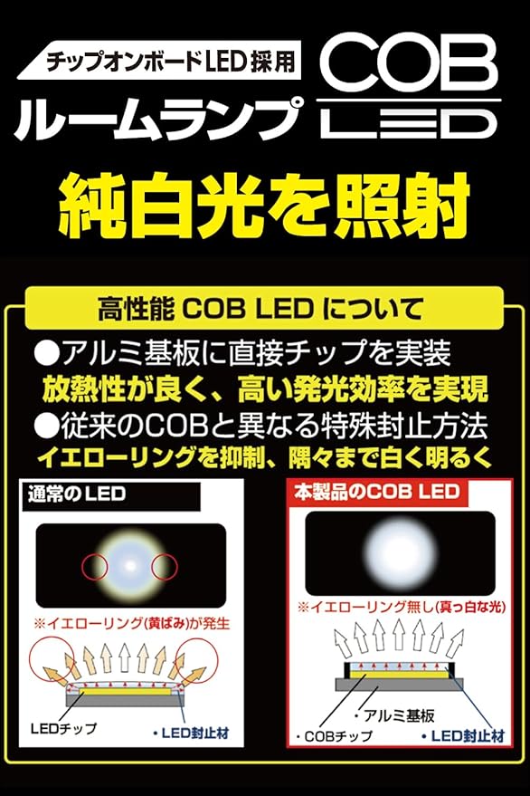 従来のCOBは発光時に蛍光体の黄色(イエローリング)が出ますが、本製品は特殊封止方法でイエローリングを抑制