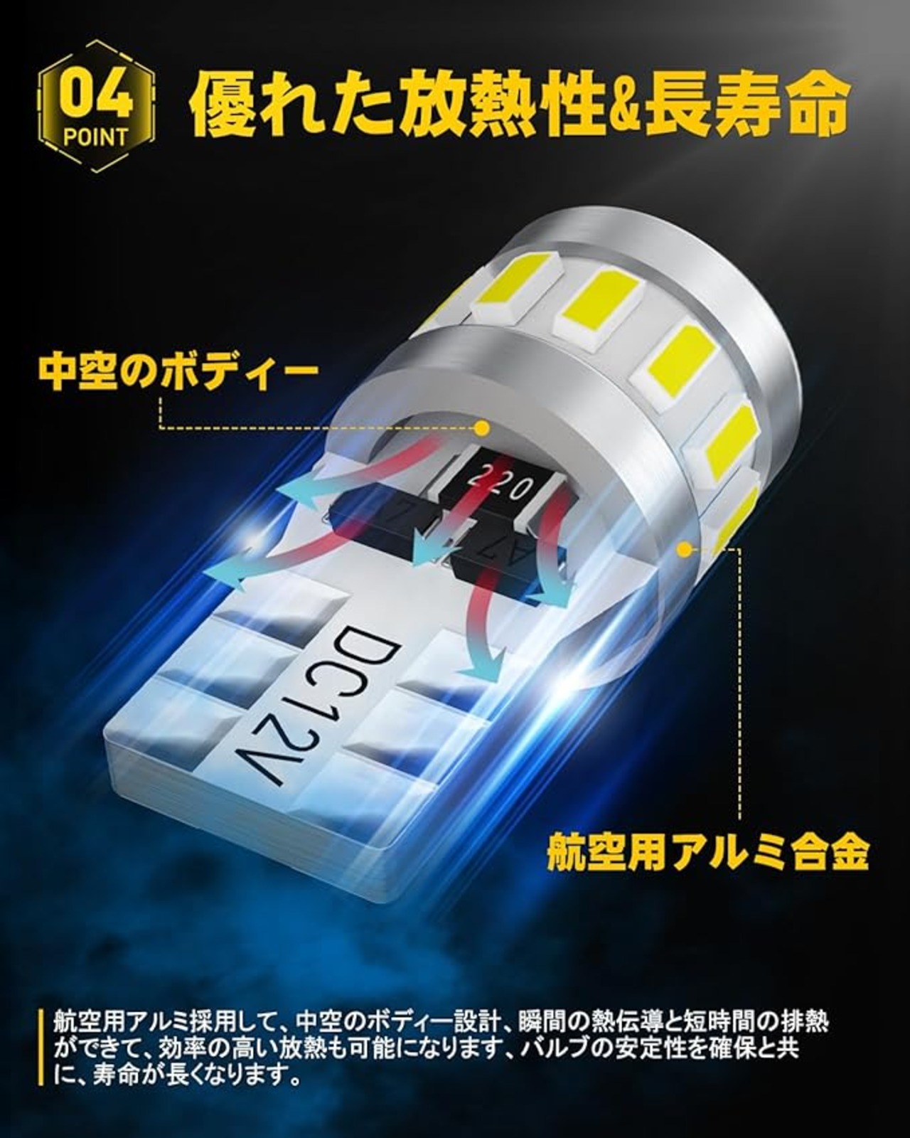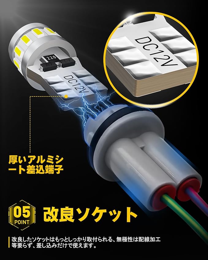 【改良したソケット&耐久性抜群】改良したT10ソケットはもっとしっかり取付られます。全面的に導電でき、市販品の導電鉄線より、精度が高く接触不良等心配がありません。航空用アルミ採用して、中空のボディー設計、瞬間の熱伝導と短時間の排熱ができて、効率の高い放熱も可能になります。バルブの性能を確保でき、寿命がハロゲンより100倍以上長くなります。