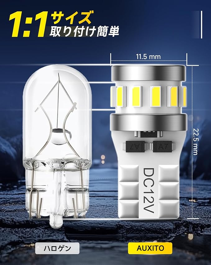 【ハロゲンサイズ】純正T10ハロゲンと同等の大きさで、また無極性から、どんな電極でも点灯できます。取付簡単、差し込むだけで使用可能です。手間がかかりません。